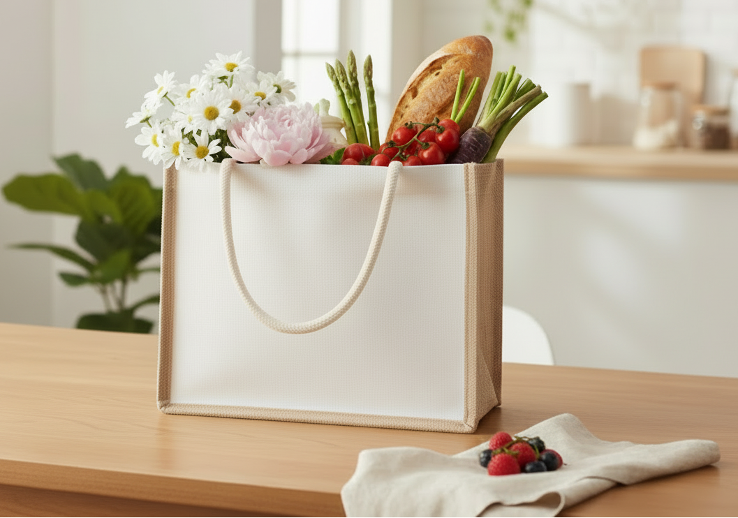 Die Umrandung aus natürlicher Jute verleiht der Tasche einen rustikal-eleganten Look.